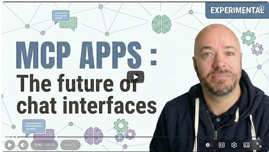 Burke Holland introduces MCP Apps—a new capability that lets MCP servers return rich, interactive UIs directly in the AI chat window. The video walks through building an MCP app from scratch, covering server setup with the TypeScript SDK, bundling UI with Vite, bidirectional communication between client and server, and the promise pattern for forcing the chat to wait for user input. It’s a practical, hands-on tutorial aimed at developers who build or consume MCP servers.