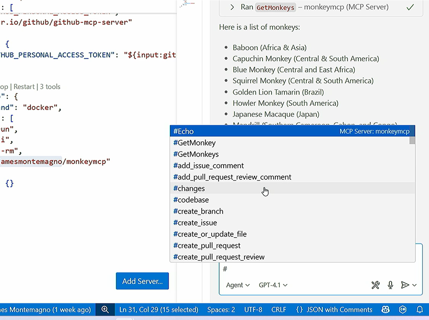 Developer Tools Integration: Microsoft has integrated MCP support into its developer tools ecosystem, with Visual Studio Code and GitHub Copilot serving as MCP hosts. As mentioned in the session, “Different tools such as VS Code and Visual Studio have different ways of configuring MCP servers.”