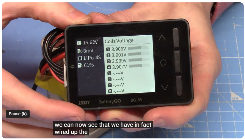 The functionality verification involves checking the balance connector readings. Proper wiring is confirmed when individual cell voltages are displayed correctly. Incorrect wiring would result in bizarre readings or error messages from the charging equipment.